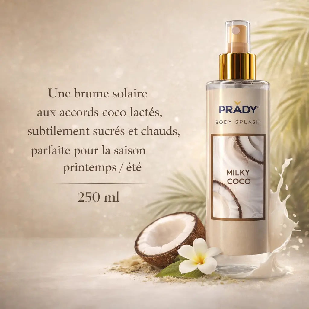 Milky Coco – Une brume solaire aux accords coco lactés, subtilement sucrés et chauds, parfaite pour la saison printemps / été.
