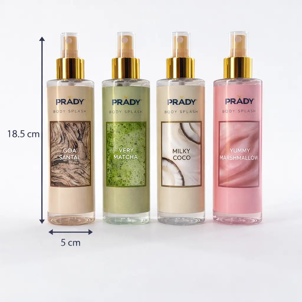 Lot de 4 brumes corps et cheveux PRADY 250 ml – Goa Santal, Very Matcha, Milky Coco, Yummy Marshmallow – Body Splash femme parfum léger gourmand solaire longue tenue