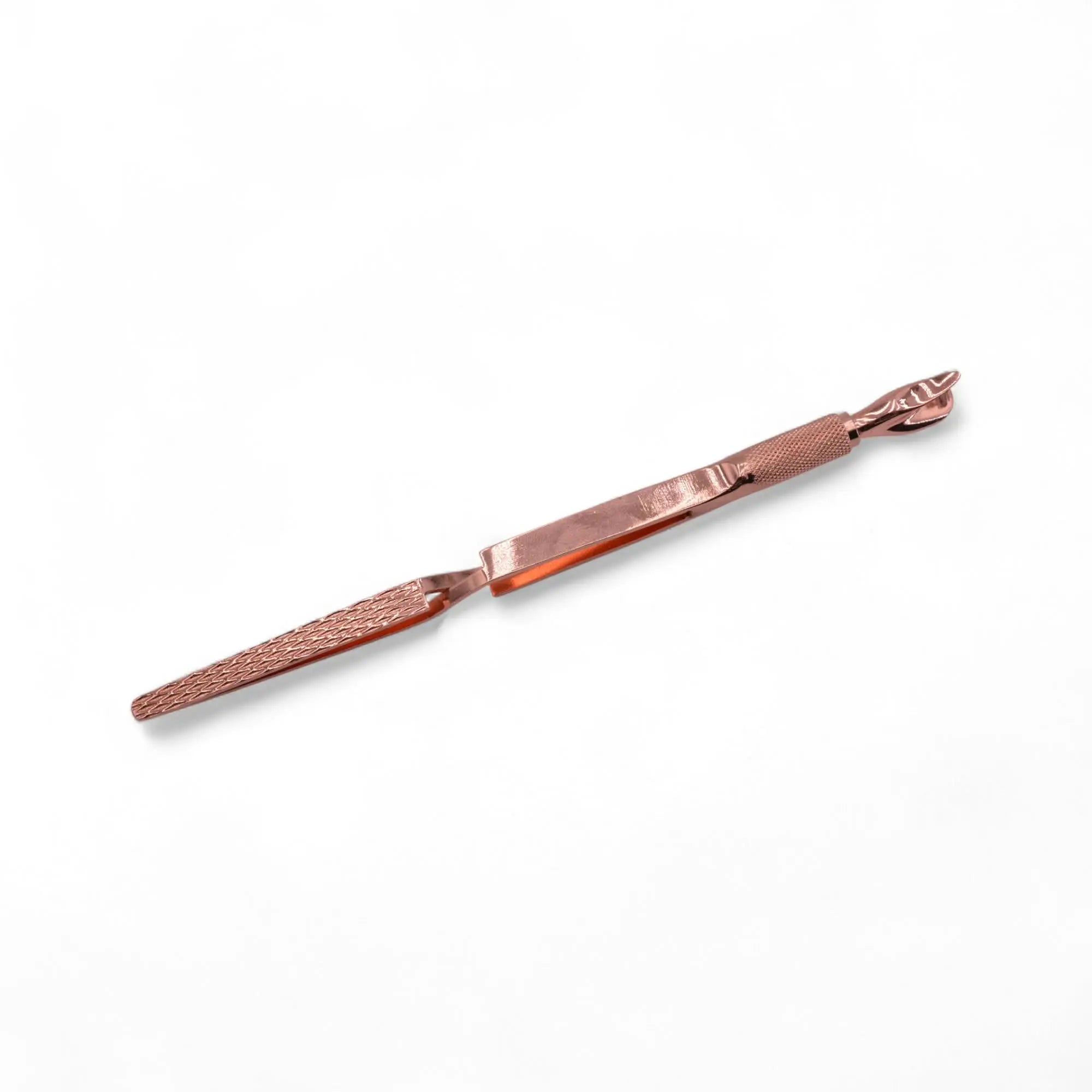 Outil 2 en 1 Pince à Pincher et Repousse Cuticules en métal Gold Rose. Un outil essentiel pour une préparation des ongles précise et efficace, parfaitement adapté à une utilisation professionnelle.